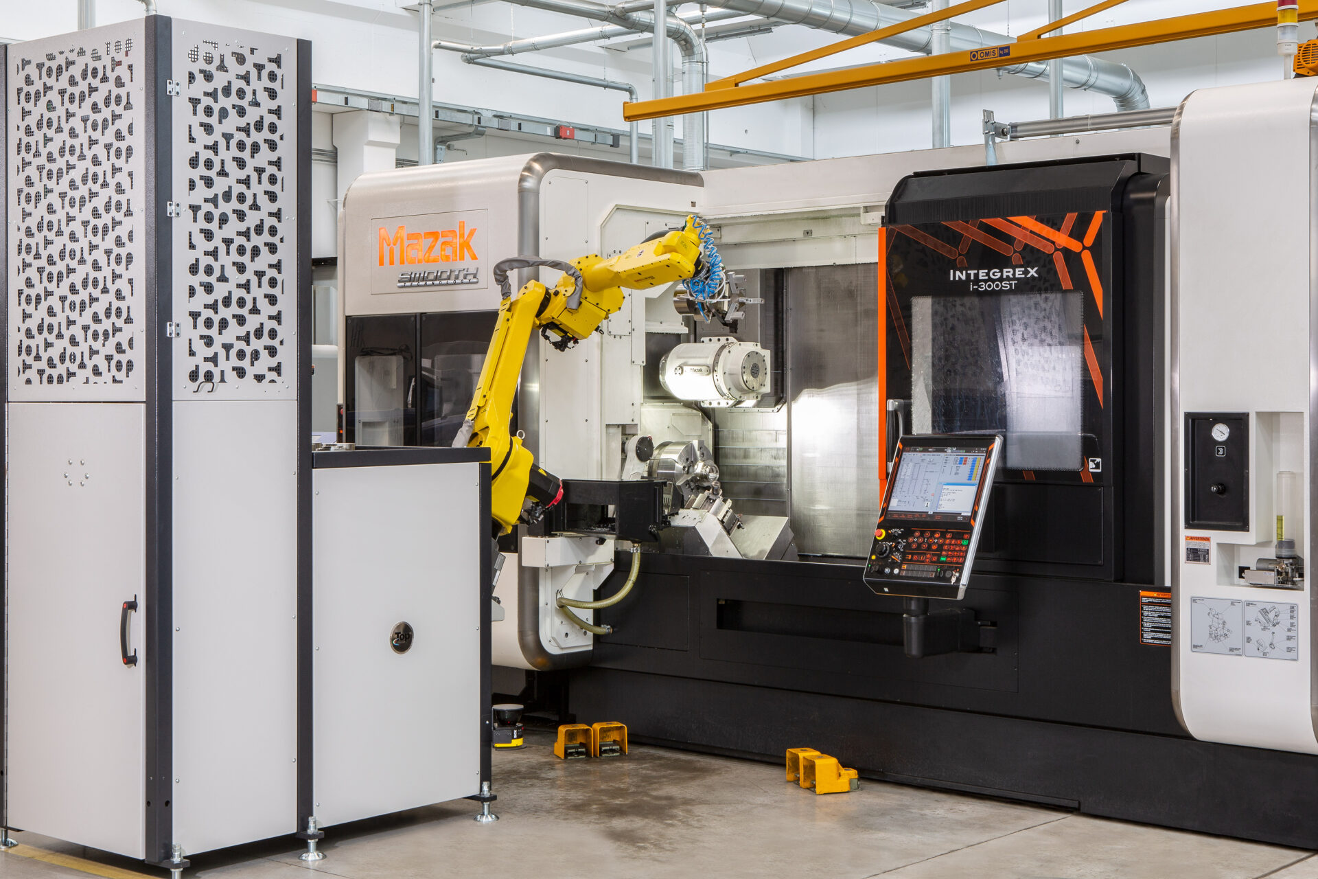 5 assi in continuo, diametro tornibile 300 mm, torretta inferiore a 12 stazioni, magazzino 112 utensili. Dotato di sistema robotizzato GL150 per carico/scarico e caricatore automatico passaggio barra diametro 52 mm.