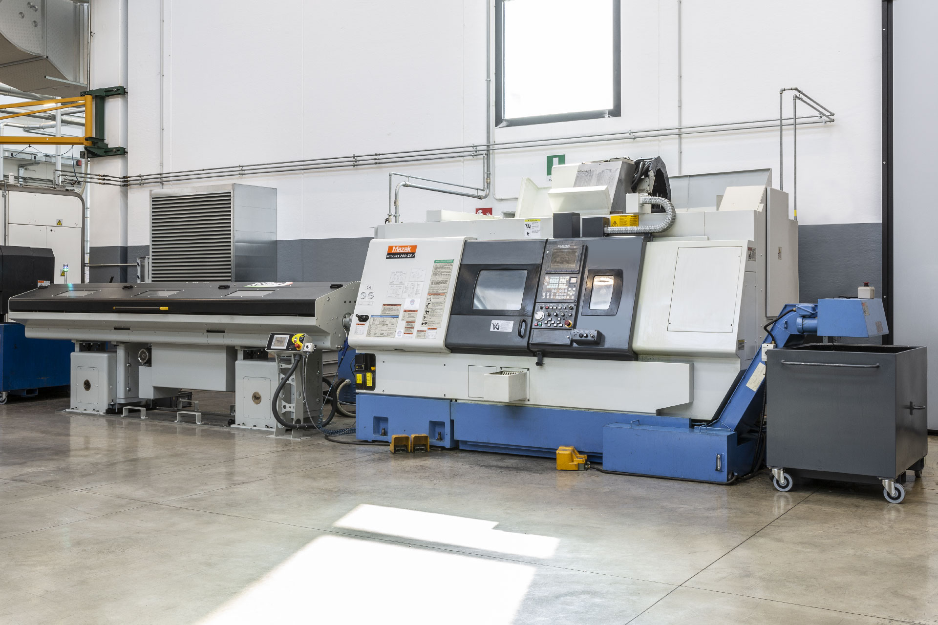 3 torrette motorizzate, 2 assi C, 3 assi Y, caricatore automatico passaggio barra diametro 70 mm e sistema di caricamento a portale gantry con braccio robot.